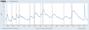 But now wait a minute, you writer with the fancy pen, you said that Gretzky was great because he skated to where the puck was going, not where it had been. If that’s the case, maybe skating to the idea that we’ve gotten everything we are going to out of this cycle is the right thing to do. Looking at this chart from the invaluable data engine at the St. Louis Fed (FRED) shows that going back 70 years, something in the mid-threes to low-fours has been the bottom threshold for the unemployment rate. And that is indeed where we are. Also notice that the rate is often at its lowest for a cycle in the few months right before a recession begins.