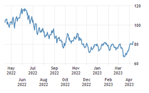 The world’s most important commodity has been very well behaved over the past year. Coming down nicely in the face of a slower global economy. Taking a little bit of heat off the inflation gauges. We only spiked last week because OPEC+ decided a production cut was good for business. If it starts heading back to $70 on the way to $60, you will know things are slowing down.