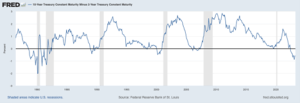 Back to the topic at hand, what are the signs economists are looking at in the here and now? The chart of the yield curve (10’s minus 2’s) is showing clear signs that something is about to change in the economy. When you get paid more to hold money short, than long, there is risk out there. In each of the last six recessions, the curve inverted just prior. That’s a consistent number.