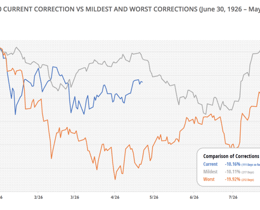 Corrections are defined as a drawdown greater than 10% and less than 20% from an all-time high. This correction would currently rank as the second mildest on record should the market recover to new highs from here. On average, corrections have a 13.3% drawdown and last almost 8 months from peak-to-peak. The mildest correction charted above lasted from September 1967 to April 1968, while the worst correction began in July 1990 and ended in February 1991. Should the current event follow a similar timeline, we would expect the market to begin to set new highs towards the end of August this year.